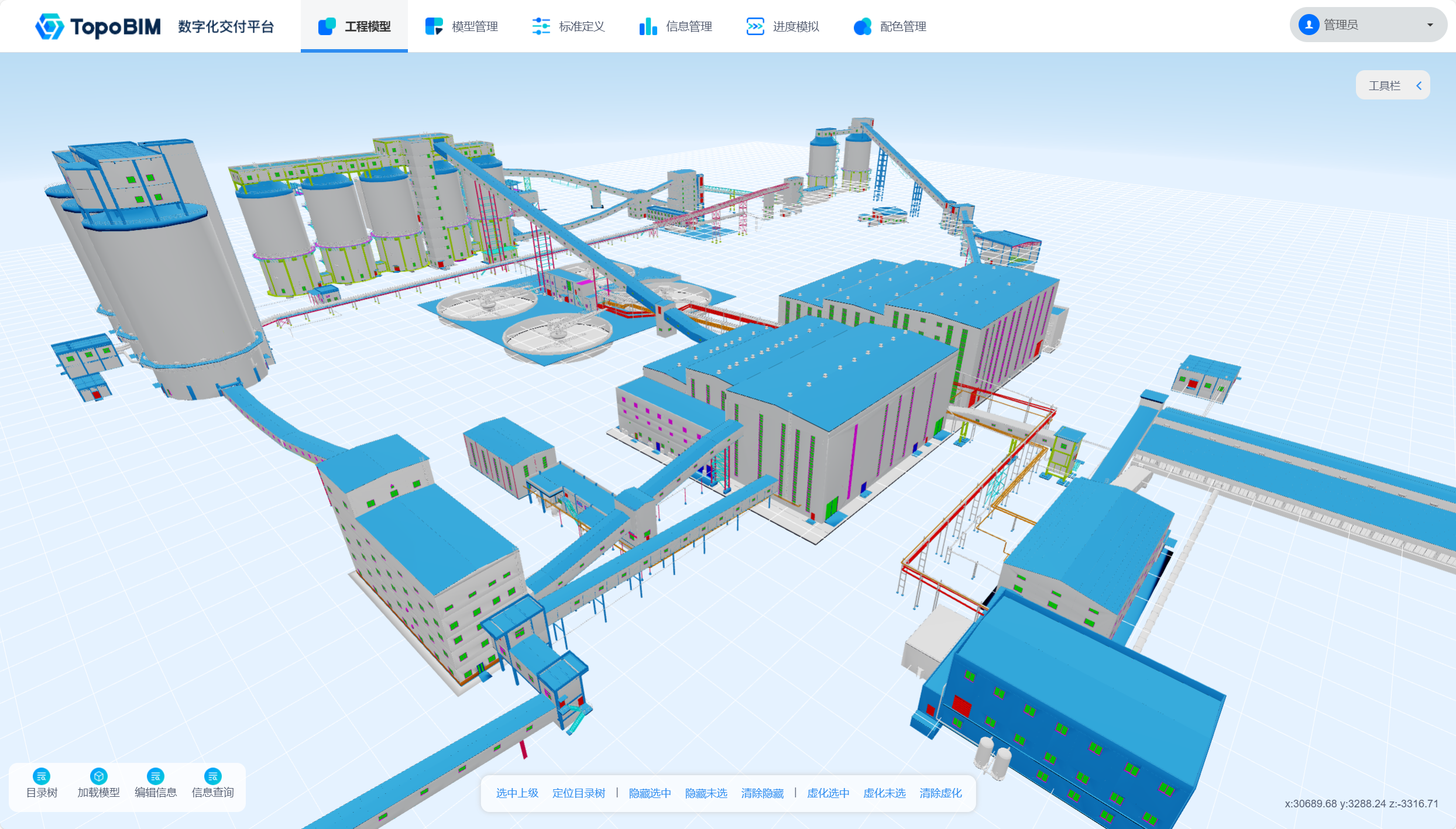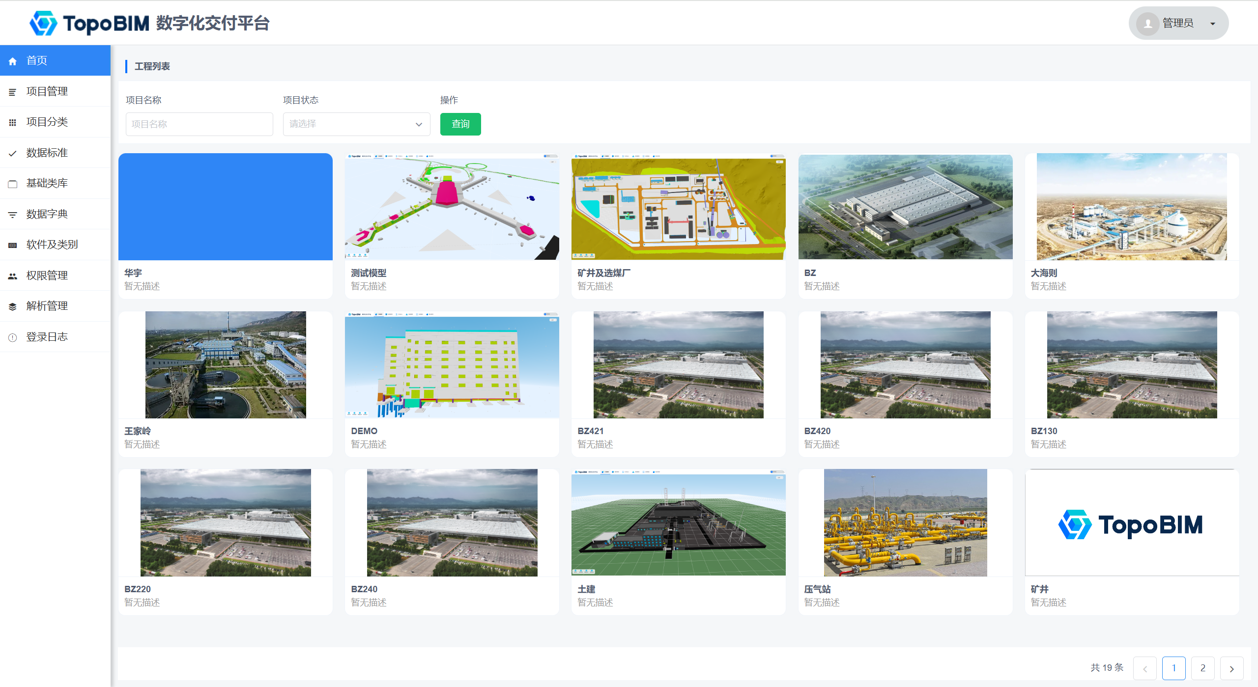 TopoBIM 是承载以工程对象为核心的数据、文档和三维几何模型及其关联关系,管理工程建设过程中产生的需要交付的设计信息、施工信息、竣工信息等内容,传递工程项目建设阶段数字化创建的静态信息,并可与多种工程软件集成并兼容多种文件格式的数字化管理平台。